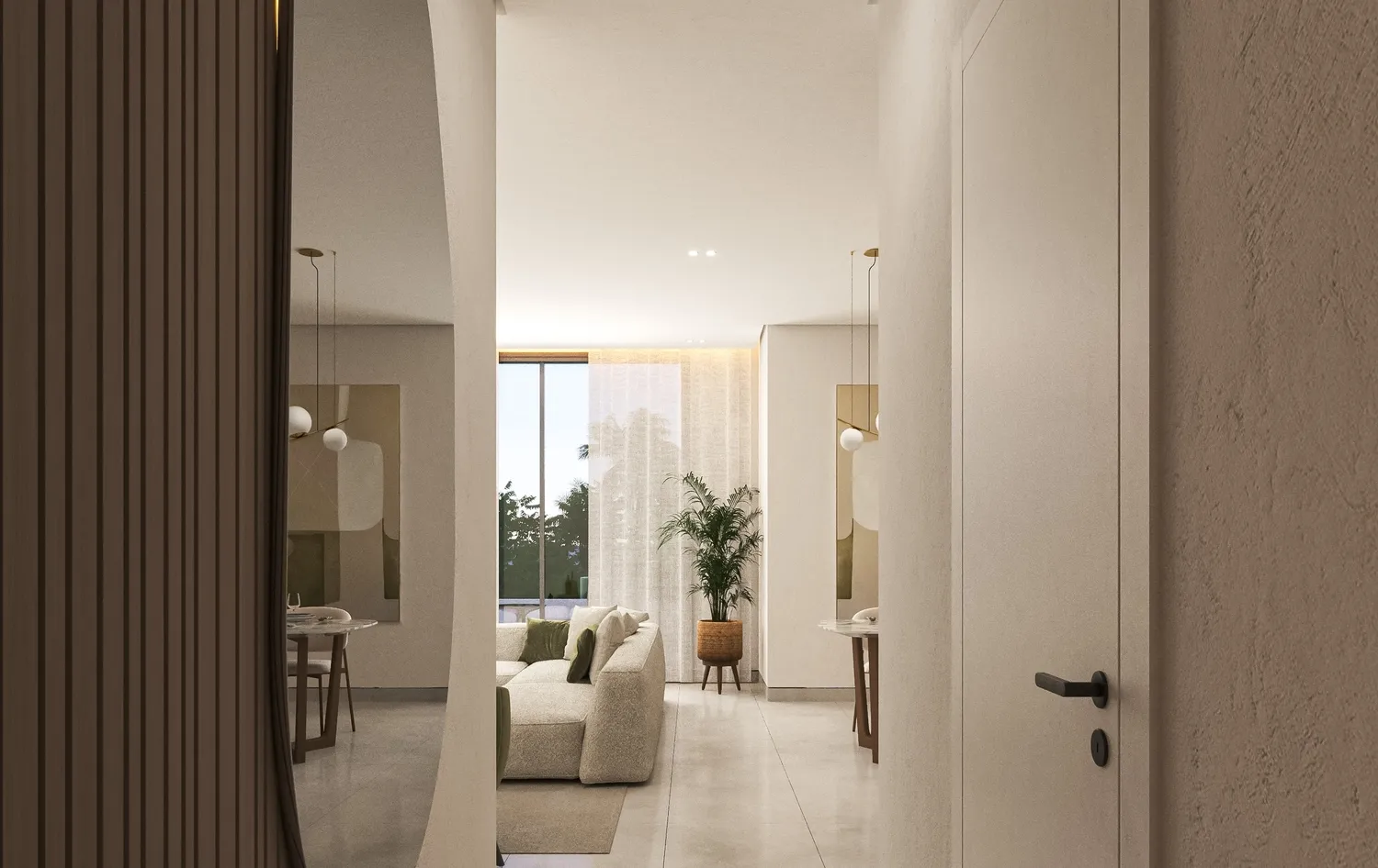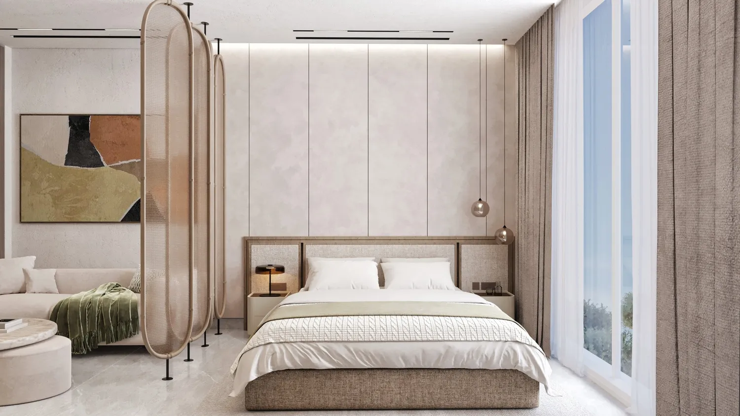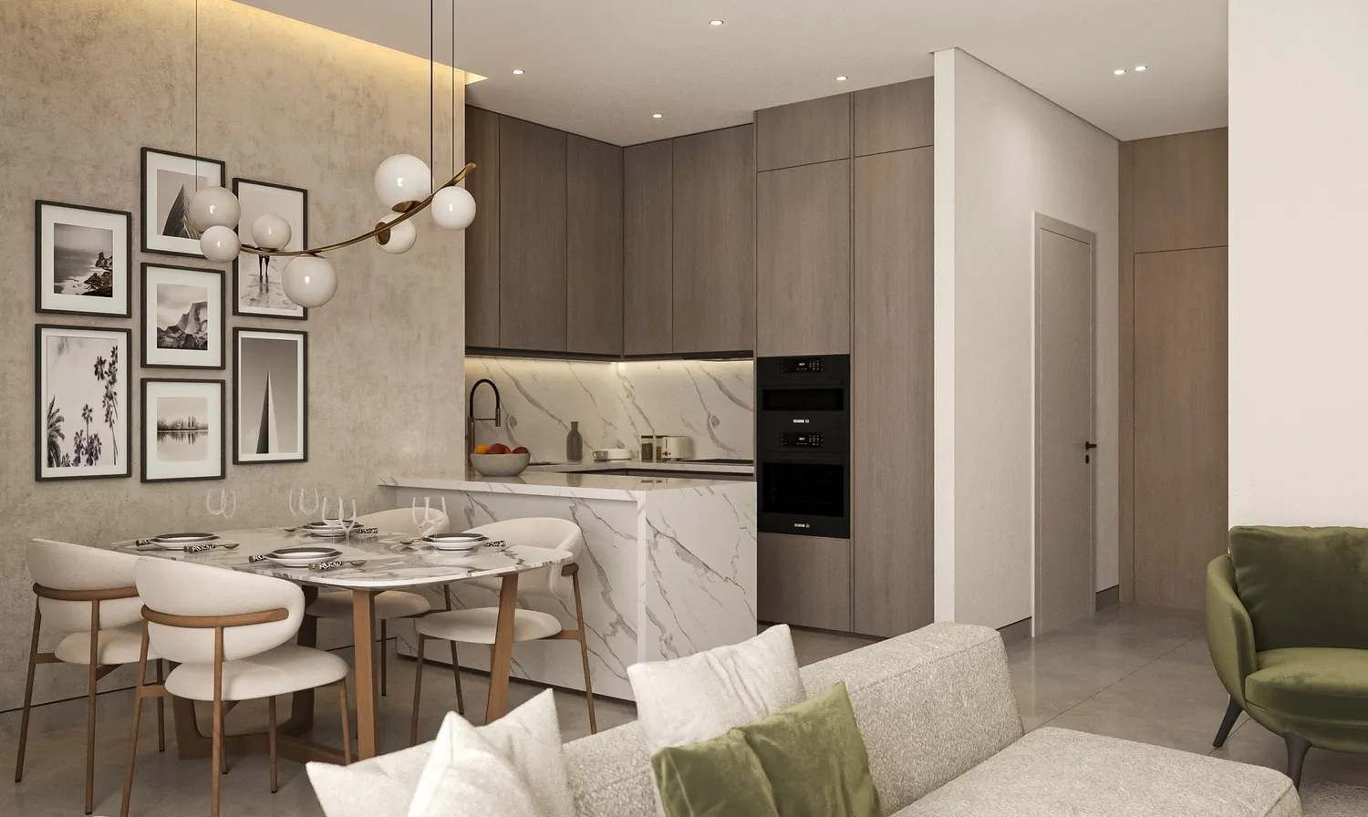 Interiors at AB Hills feature modern, high-quality finishes with a neutral, timeless palette. Materials include large-format floor tiles, textured wall finishes, and floor-to-ceiling windows that enhance natural light. Kitchens are equipped with built-in cabinetry, stone countertops, tiled backsplashes, and integrated kitchen appliances. The apartments are semi-furnished, with fixed joinery and kitchen appliances included, while allowing residents flexibility to personalize living and bedroom spaces.