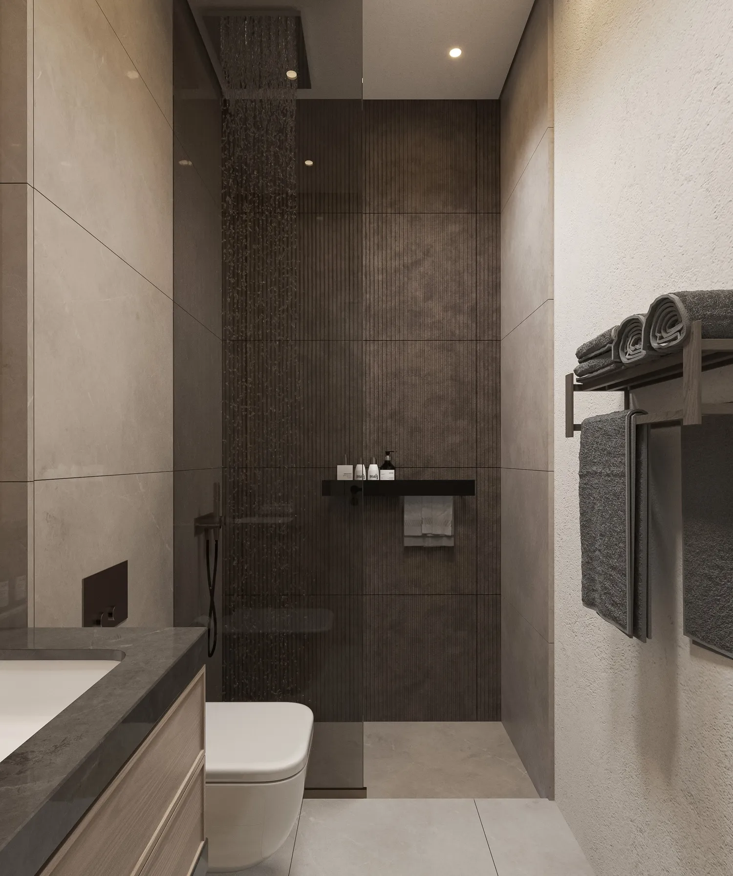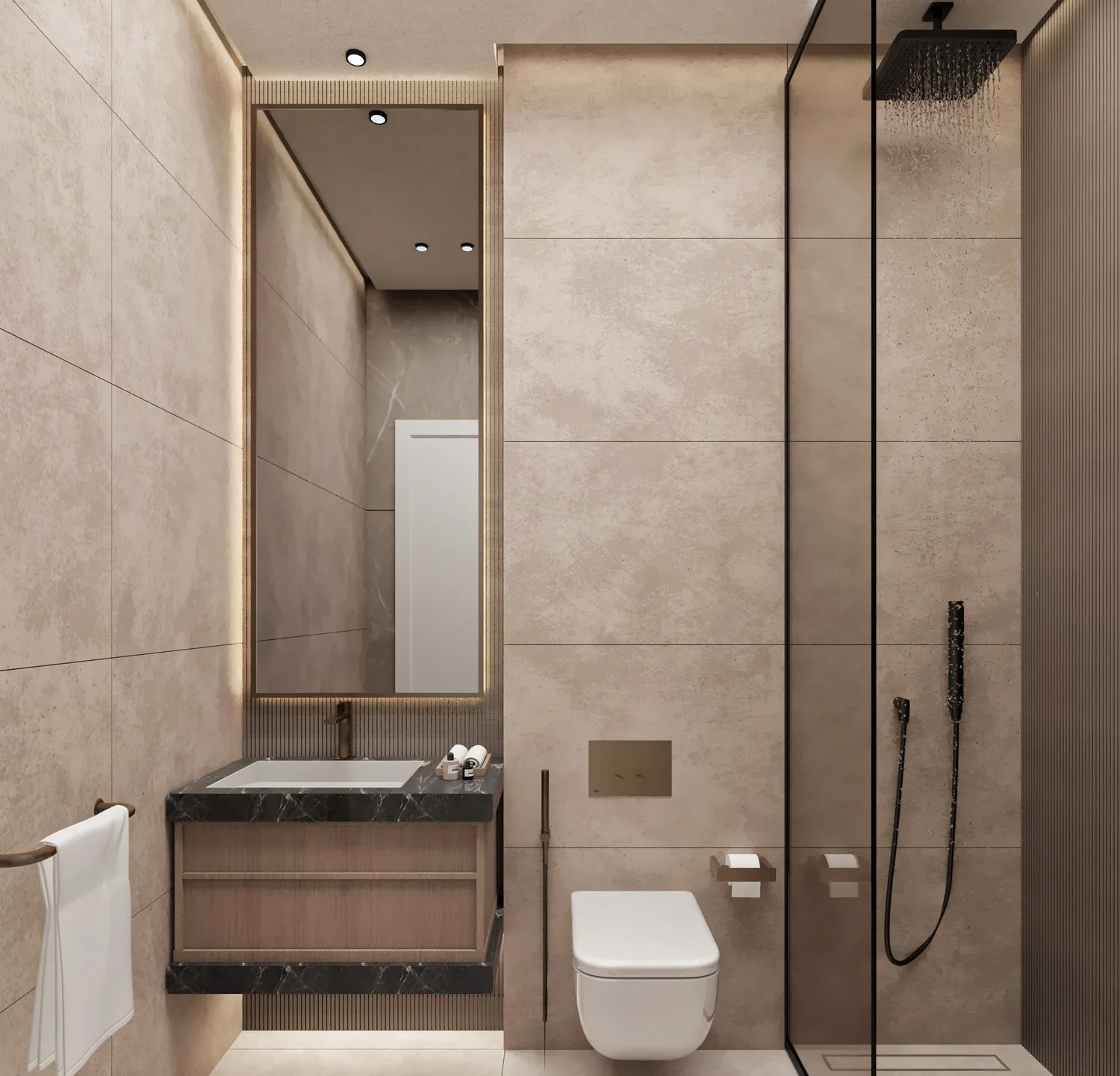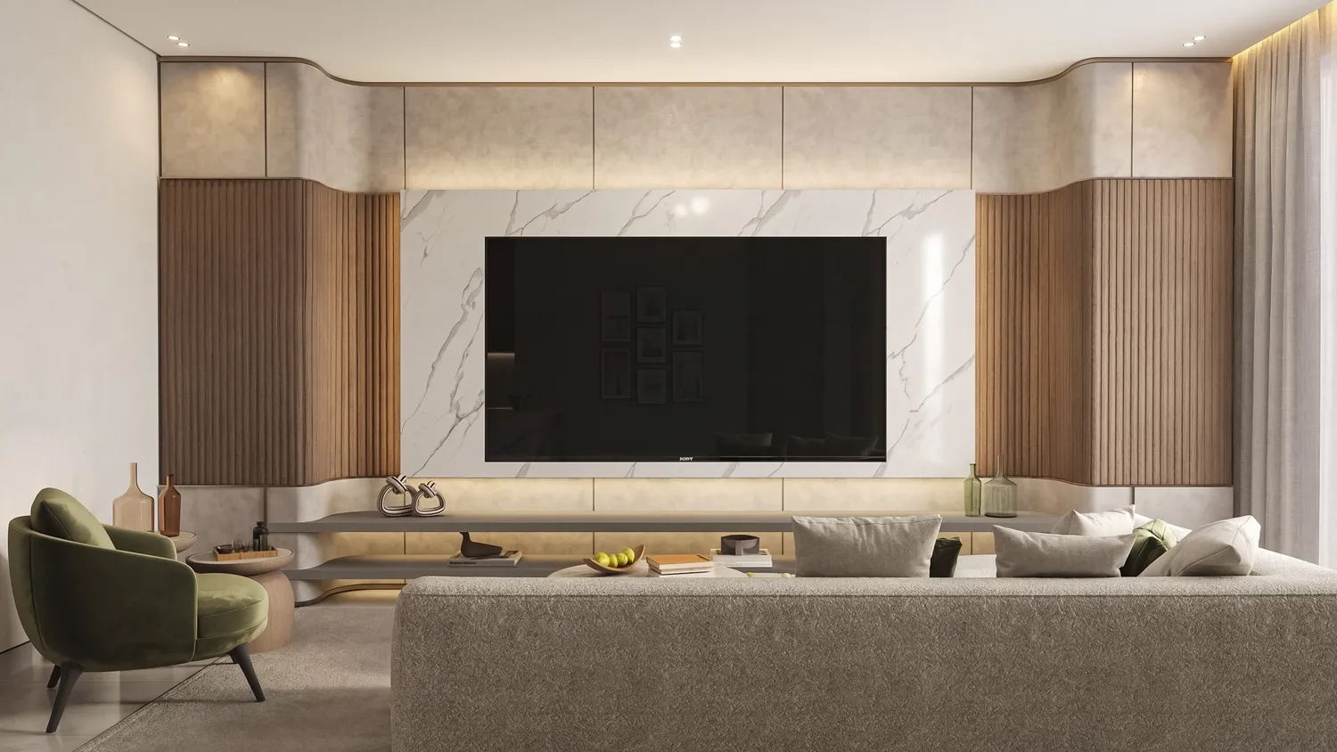 Interiors at AB Hills feature modern, high-quality finishes with a neutral, timeless palette. Materials include large-format floor tiles, textured wall finishes, and floor-to-ceiling windows that enhance natural light. Kitchens are equipped with built-in cabinetry, stone countertops, tiled backsplashes, and integrated kitchen appliances. The apartments are semi-furnished, with fixed joinery and kitchen appliances included, while allowing residents flexibility to personalize living and bedroom spaces.