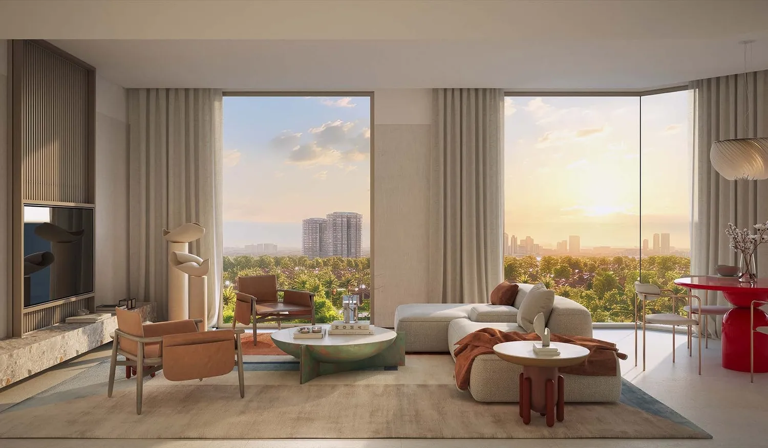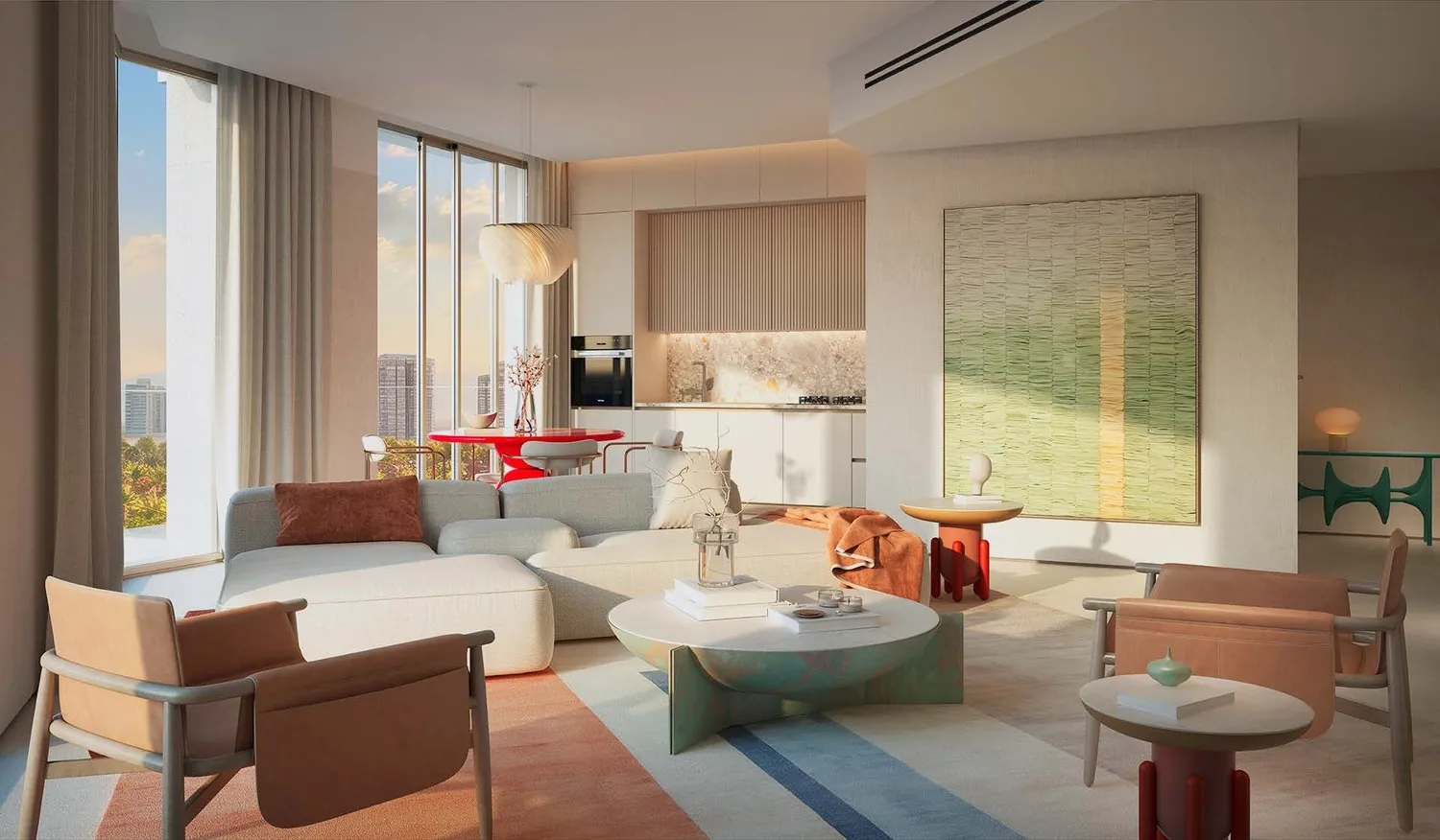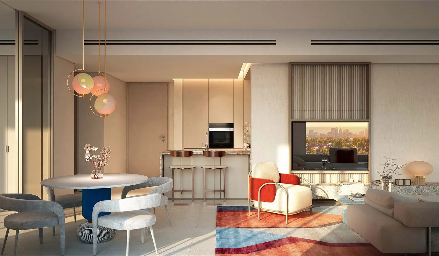 Interiors are finished with modern, high-quality materials and a clean, contemporary aesthetic. Apartments feature well-designed layouts with refined flooring, elegant wall finishes, and large windows that enhance natural light. Kitchens are fully fitted with quality cabinetry, durable countertops, and integrated appliances, while the residences are delivered semi-furnished, providing essential built-in elements that allow residents to personalize their living space.