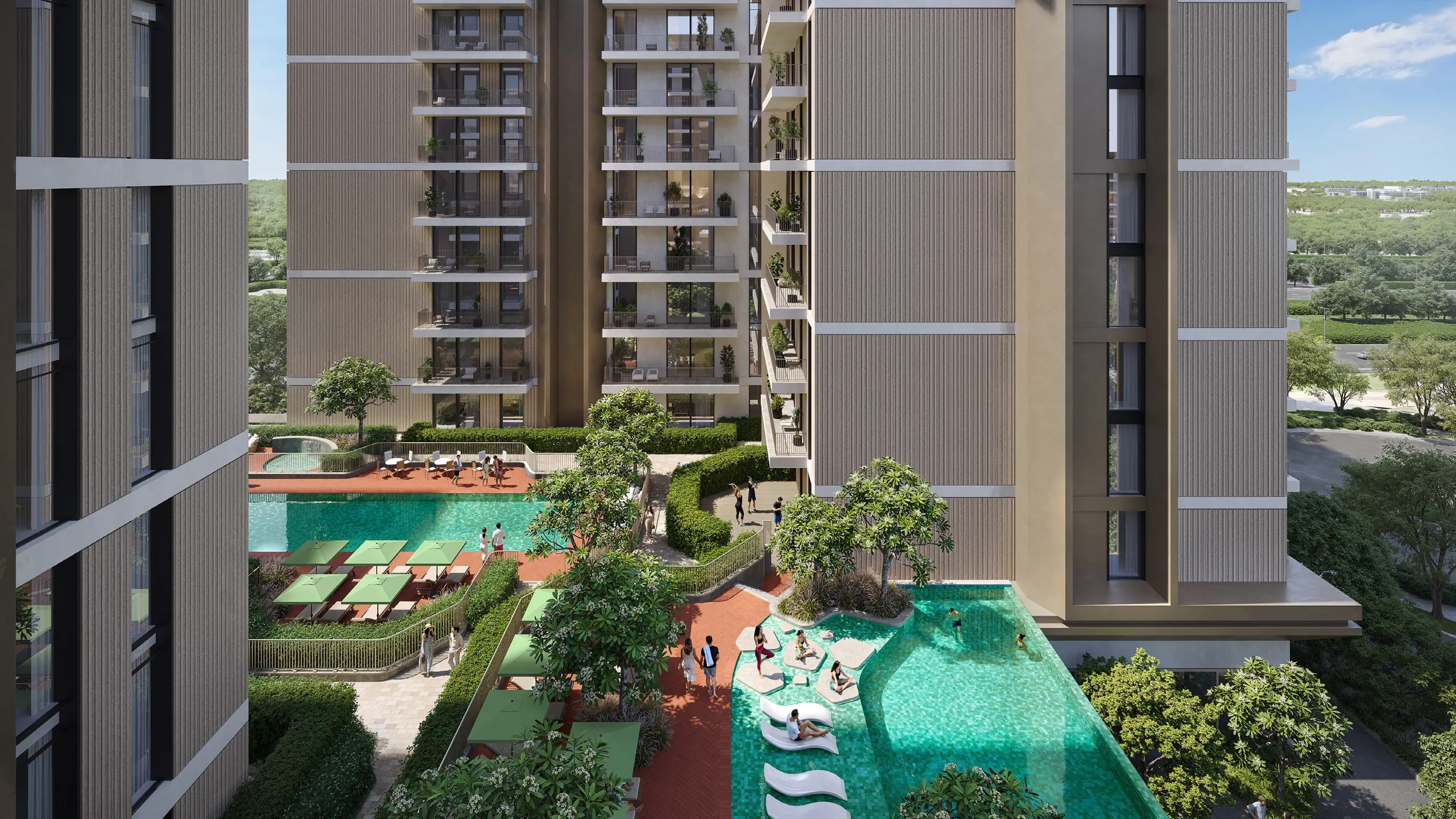 Ghadeer is a nature-inspired residential building nestled within the heart of Expo Valley Views, where architecture gently blends with the surrounding landscape. Designed to follow the natural contours of the valley, Ghadeer rises organically from the terrain, opening toward light, greenery, and expansive views, and offers a refined selection of 1, 2, and 3-bedroom residences arranged across multiple floors. A sense of calm, balance, and connection to nature defines the character of this residence, reflected in its soft architectural lines, earthy tones, and tranquil outdoor settings. Residents of Ghadeer enjoy seamless access to the extensive lifestyle and wellness amenities thoughtfully distributed across the ground floor and podium levels of the community. These include multiple swimming pools with lap, infinity, and children’s areas, main and satellite gyms, yoga spaces, an indoor kids’ club, prayer rooms, an indoor games room, multipurpose halls, BBQ and outdoor dining areas, a vibrant community plaza, and landscaped event lawns. Together, these amenities create a resort-like atmosphere that supports wellbeing, leisure, and social connection. The interiors of Ghadeer reflect a refined, nature-led aesthetic, showcased through soft natural tones, warm neutrals, contemporary wood finishes, and clean architectural detailing. Large windows invite abundant natural light, enhancing the sense of openness and balance throughout each home. Two interior palettes — Timeless Elegance, with its refined monochrome character, and Calm Canvas, inspired by natural textures and materials — allow residents to choose a style that aligns with their personal sense of serenity and understated luxury.