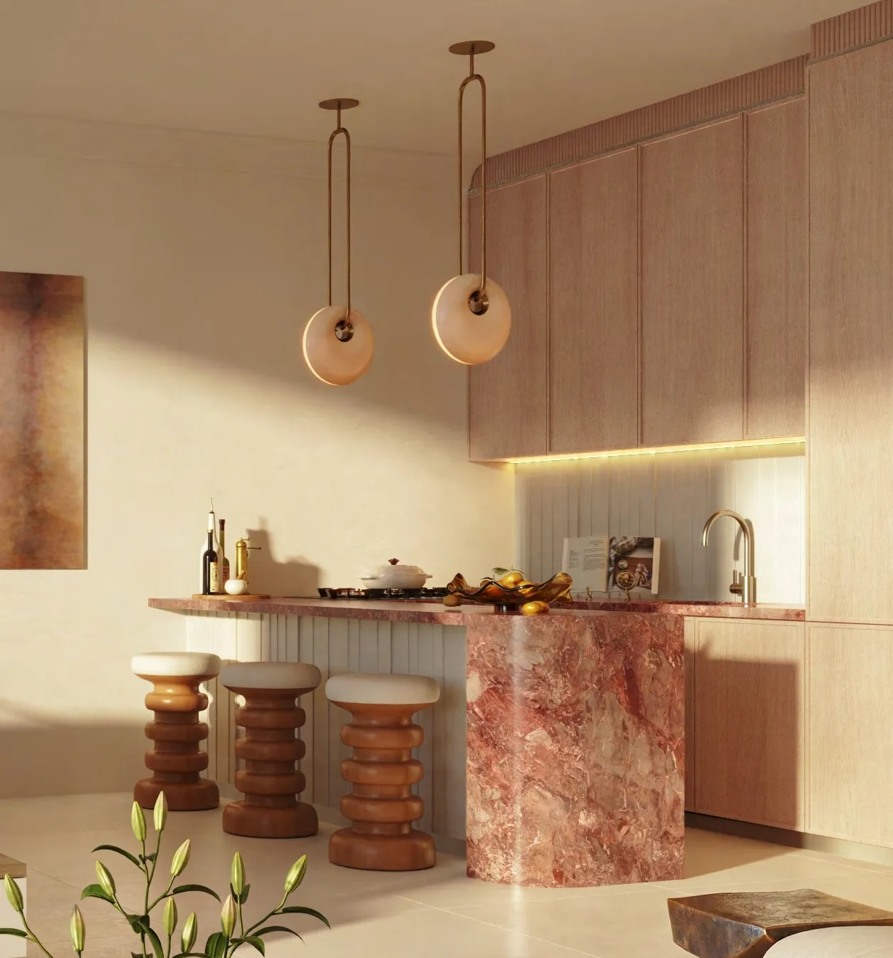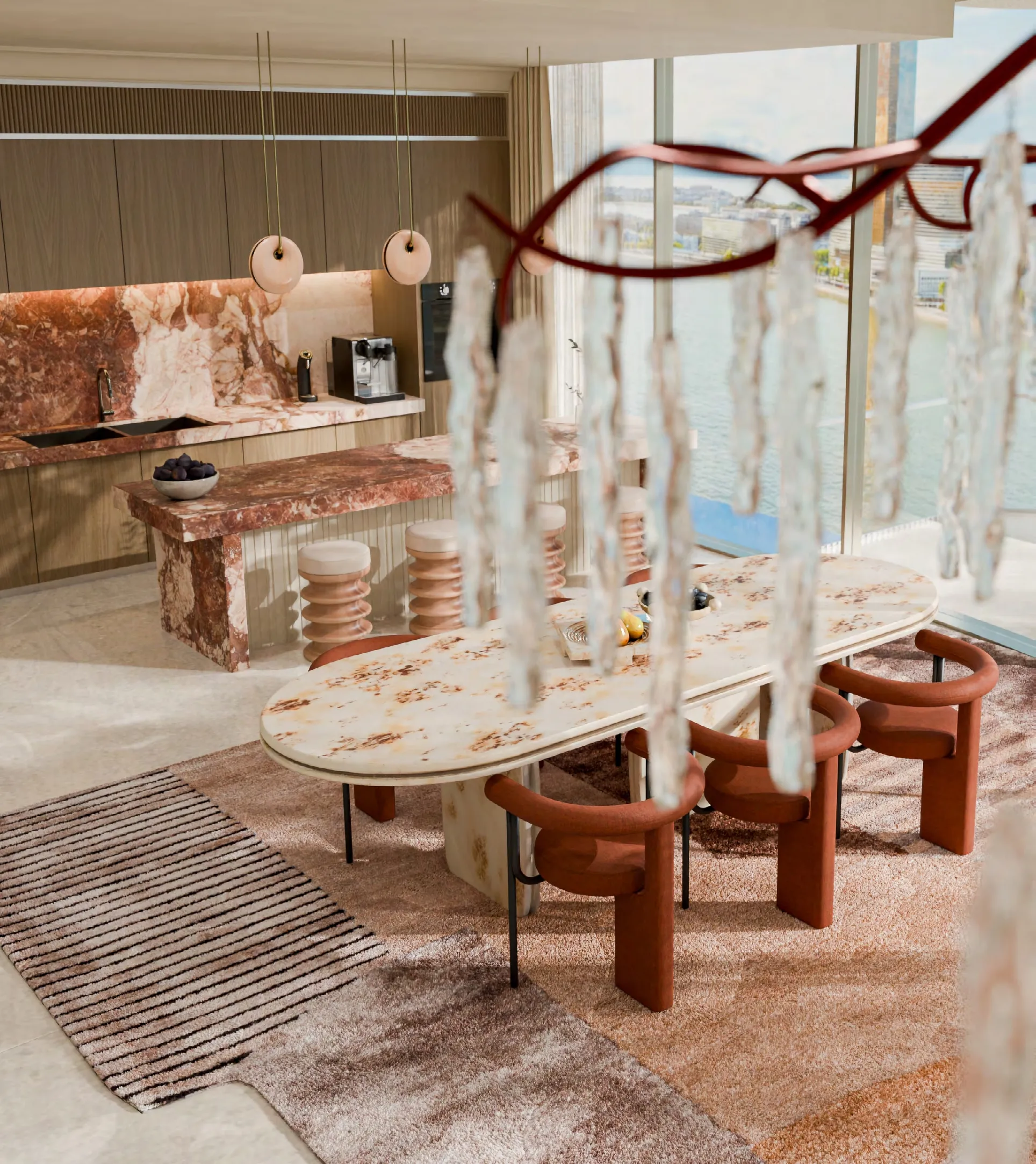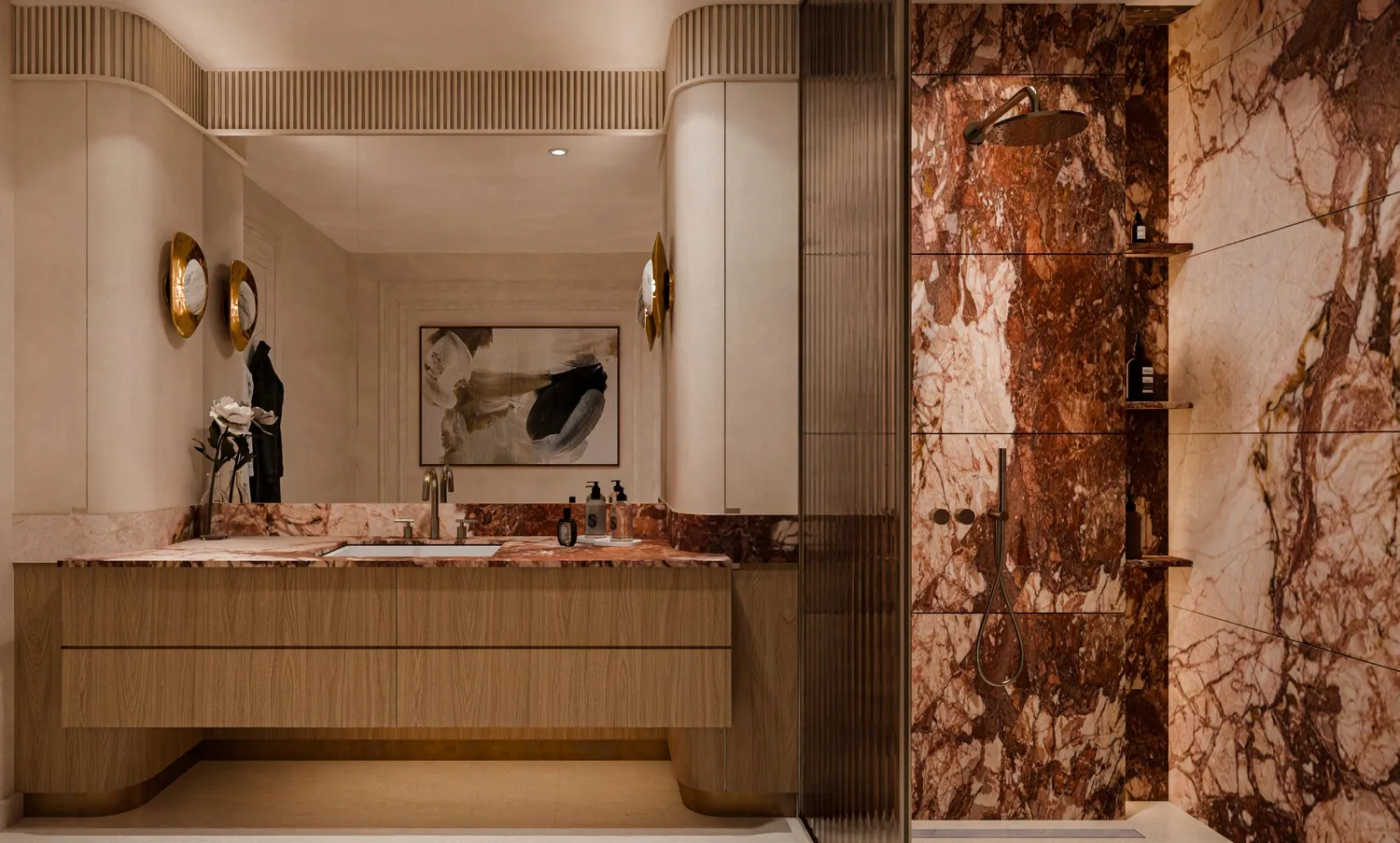 Interiors are composed around light, balance and quiet refinement. Floor-to-ceiling glazing and generous balconies extend living spaces outward, reinforcing openness and connection to the landscape. The kitchen continues the architectural language of the project through refined materials, neutral tones and carefully integrated detailing that blends functionality with visual harmony. Bedrooms feature spacious layouts, large openings and a calm material palette, while bathrooms are finished in warm neutrals with refined surfaces and soft lighting, creating timeless, composed environments defined by proportion and material integrity.
