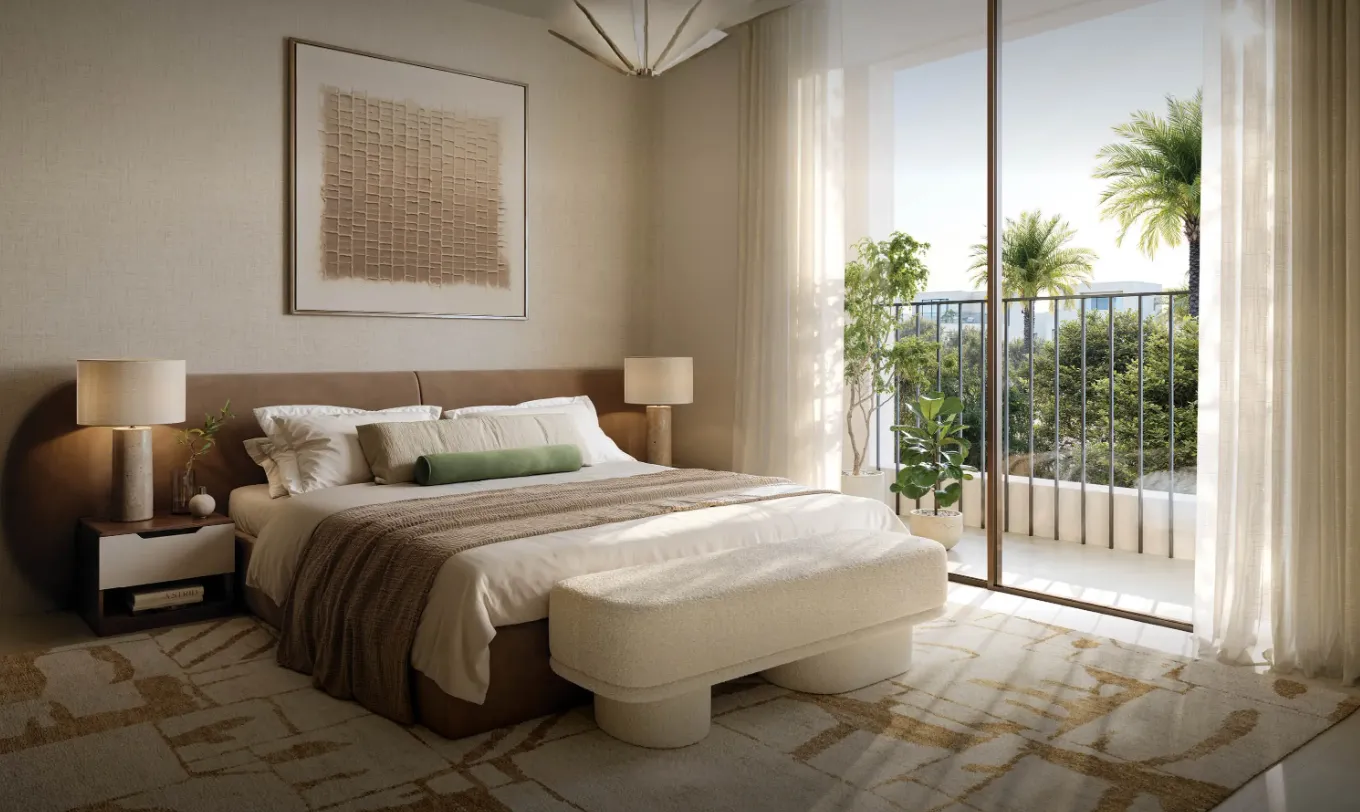 The villas feature light-filled interiors with neutral color palettes, tactile surfaces, and refined detailing throughout. Finishes focus on natural tones and high-quality materials that enhance a sense of warmth and understated elegance. Kitchens are designed as functional yet stylish spaces with fitted cabinetry, stone countertops, and integrated appliances where specified. Residences are delivered without full loose furniture, allowing owners flexibility in personalization, while built-in elements and joinery reflect a cohesive, contemporary design language.