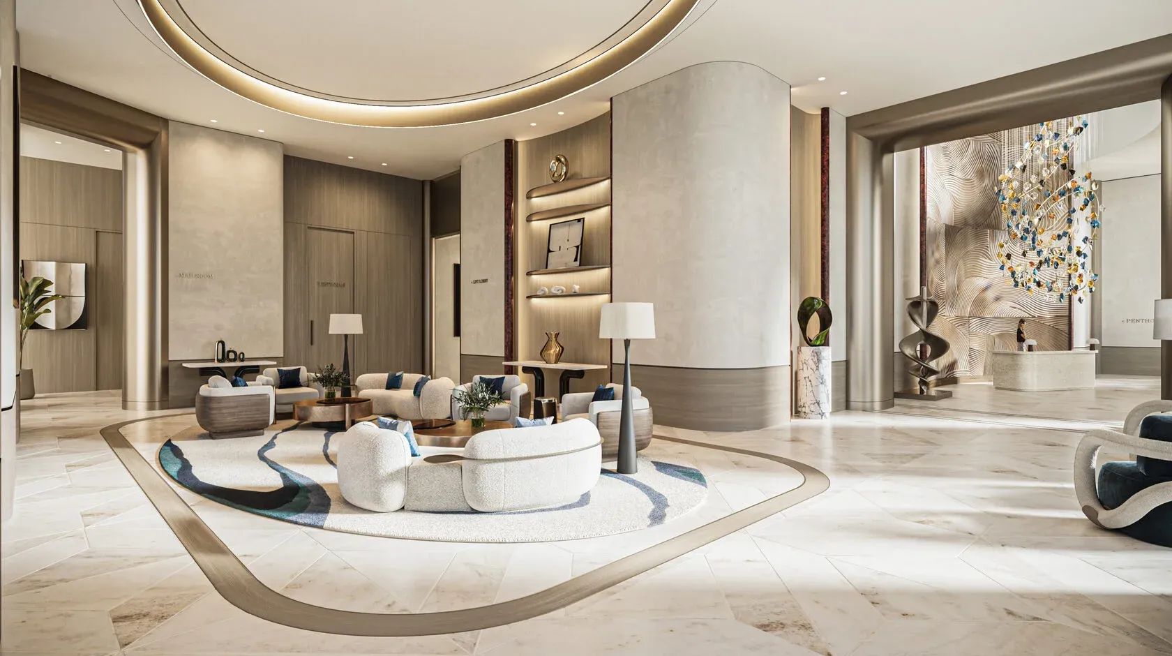 Residents enjoy an extensive collection of carefully curated amenities designed to enrich daily life. These include an infinity horizon pool, indoor and outdoor pools, a sanctuary spa with sauna, steam and cold plunge, elite fitness club, yoga and Pilates studios, a prestige cinema and media lounge, executive golf simulator lounge, squash court, signature residents' club, co-working lounges, treatment rooms, luxury retail boulevard, enchanted kids’ wonderland, cafés, community kitchen, library, and beautifully appointed guest suites. Thoughtful spaces such as the verdant staircase atrium and grand lobby arrival further enhance the sense of calm sophistication that defines the community.