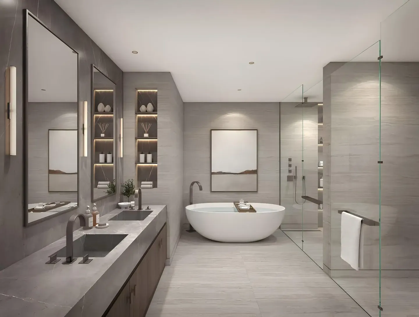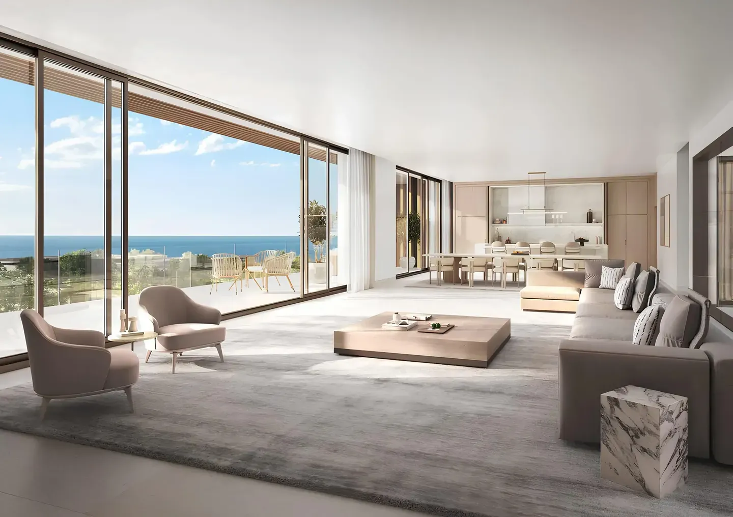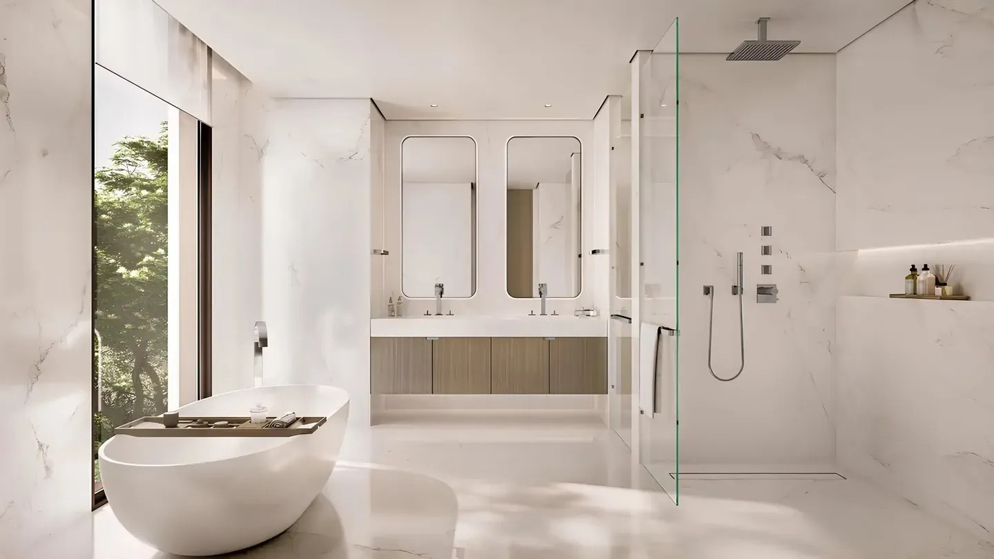 Interiors are finished with a refined palette of high-quality materials, including marble flooring in main living areas and bathrooms, engineered wood in bedrooms and walk-in closets, and porcelain finishes in service zones. Kitchens feature stone countertops and backsplashes with bespoke joinery, while bathrooms are detailed with marble surfaces and elegant fixtures. Custom veneer and lacquered joinery enhance storage and architectural detailing throughout the homes, delivering a sophisticated, understated aesthetic aligned with the project’s coastal character.